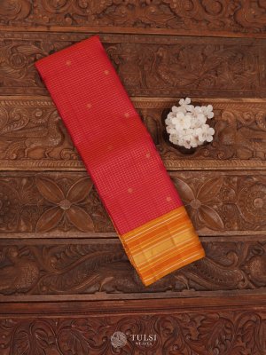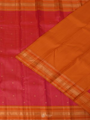This Orange Pink Kanjeevaram Silk Saree is a vibrant blend of tradition and elegance. The rich yellow pallu and lower half showcase classic Kanjeevaram weaving with lustrous gold zari detailing, giving the saree a radiant festive appeal. The contrasting pink body features subtle woven lines and tiny buttas that add refined texture without overpowering the look. Together, the bright dual tones create a striking yet graceful harmony.