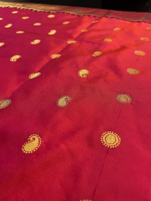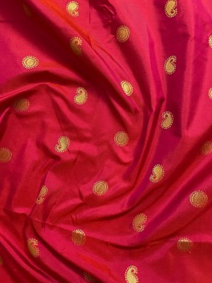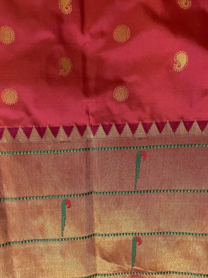 Hand-Woven Orange Pink Paithani Silk Blouse embellished with gold zari motifs paired along with a temple design border with thread detailing.