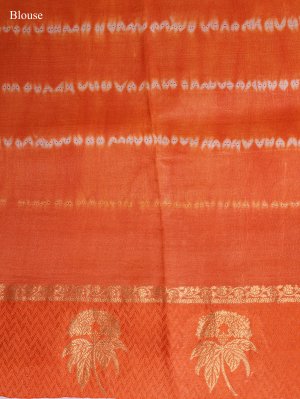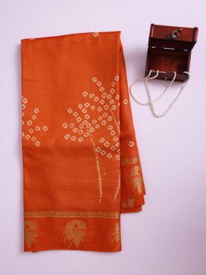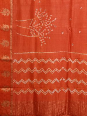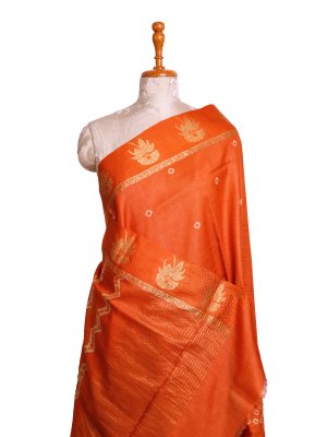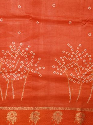 This Orange Printed Tussar Silk saree features a striking body detailed with traditional Bandhini and Shibori work for a rich, textured appearance. The drape is elegantly framed by a border featuring intricate flower and leaf motifs that add a touch of nature-inspired grace. Designed for sophistication, the vibrant orange hue and artisanal detailing make it a standout choice for any festive occasion.