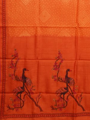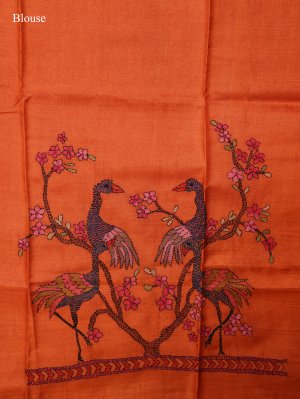 This Orange Printed Tussar Silk saree features an intricate body with elegant Shibori work and a striking Kantha embroidery border detailing. The pallu showcases a unique artistic landscape of a bird perched on a branch with a flamingo on land, creating a sophisticated and natural aesthetic. Complemented by a matching blouse featuring two flamingos and two birds, this piece is a masterpiece of traditional craftsmanship.