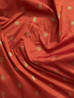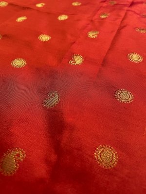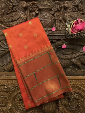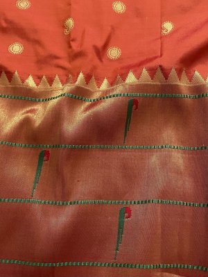 Hand-Woven Orange Red Paithani Silk Blouse embellished with gold zari motifs paired with a temple design border with thread detailing.