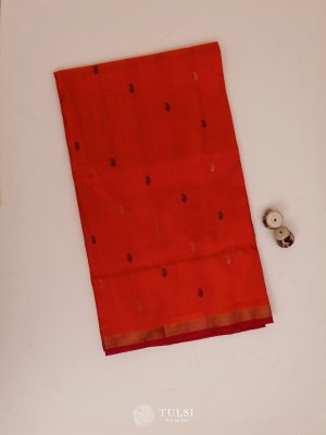 This Orange Uppada Silk Saree features beautiful floral butis on the body, paired with a delicate zari border, creating an elegant and refined look. The rich silk fabric adds a touch of grace and sophistication to any occasion.