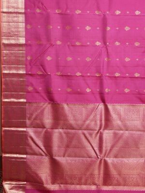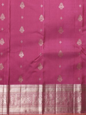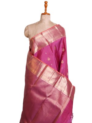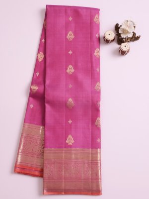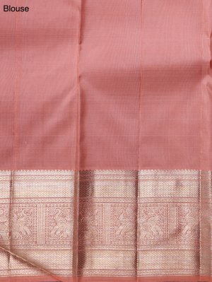 This pink Kanjeevaram silk saree features a chain flower-textured weave with an elephant motif border and vibrant peach jamad and jamadpattu edges, refined elegance, and graceful femininity. It's smart and flows. Perfect for celebrations and special occasions, it creates an unforgettable style statement.