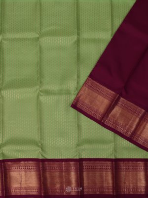 This Parrot Green Kanjeevaram Silk Pavadai features delicate golden motifs all over, exuding timeless grace and elegance. The outfit is beautifully complemented by a rich burgundy border woven with intricate zari patterns, adding a regal touch to the subtle body hue.