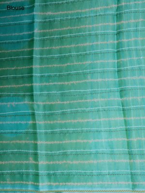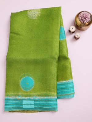 This parrot green organza saree features the organic, water color-like patterns of hand-tied Shibori, creating a luminous and high-energy drape. Intricately detailed with Sky Blue Kantha embroidery, the cool-toned stitches provide a stunning tactile contrast to the saree’s crisp, airy texture. A perfect blend of heritage and modern charm, this piece offers a structured yet ethereal silhouette for your most special celebrations.