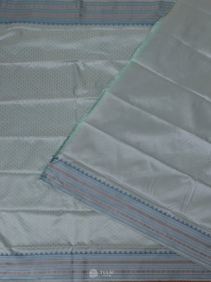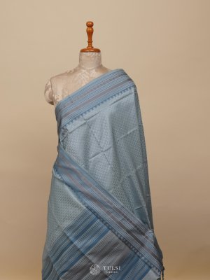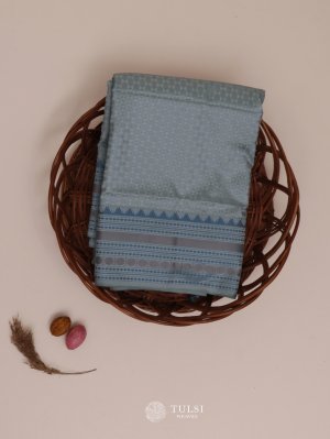 This Pastel Blue Tanchoi Silk Saree features intricate floral weaving across the body, showcasing the refined artistry of traditional Tanchoi craftsmanship. The soft Pastel Blue base is beautifully contrasted by a rich dark blue border adorned with detailed patterns, adding depth and sophistication. With its smooth, lustrous texture and graceful drape.