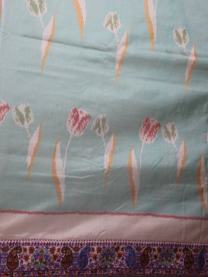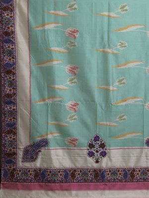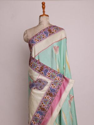 This elegant pastel bluish green Patola silk saree reflects understated luxury with its soft, lustrous silk body and graceful woven texture. The saree is beautifully framed with an exquisite Kani hand-embroidered border, showcasing intricate paisley and floral motifs inspired by traditional artistry. Rich hues of blue, pink, lavender, mustard, rust, and teal add depth and vibrance to the detailed embroidery. The harmonious blend of delicate colors and fine craftsmanship enhances the overall appeal of the saree.