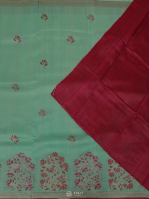 This Pastel Green Banaras Tussar Georgette Silk Saree exudes charm with its soft drape and delicate floral weaving that enhances its elegance. The saree is highlighted with a beautifully woven Banarasi-inspired border and pallu, bringing in a timeless touch. It comes with two blouse options one crafted from the saree fabric for a seamless look and a contrasting tussar blouse that adds a striking edge.