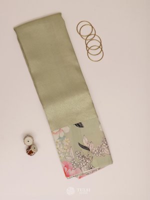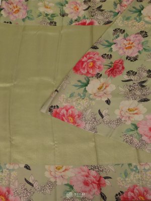 This Pastel Green Printed Kanjeevaram Silk Saree features a stunning floral design in vibrant hues of pink, and white. The soft Pastel Green base beautifully highlights the intricate floral prints, lending a modern yet timeless elegance. The saree is complemented by a rich, subtly shimmering Kanjeevaram-style border that adds a touch of grandeur.