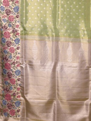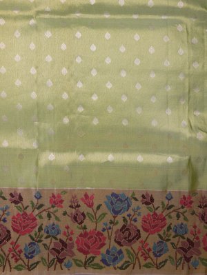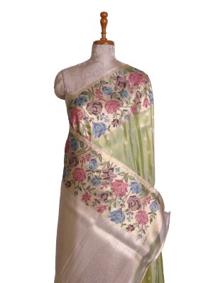 This Pastel Lime Green Tissue Silk saree presents a shimmering, metallic body texture adorned with delicate silver leaf motifs that catch the light with every movement. The beige border provides a sturdy structural contrast, showcasing a lush garden of multi-colored floral embroidery including roses and vines in shades of pink, blue, and brown. A lustrous beige pallu completes the look with a rich metallic sheen and ornate zari patterns, ensuring a striking silhouette for Grand events.