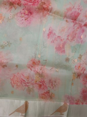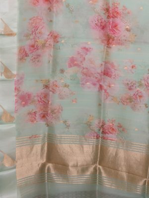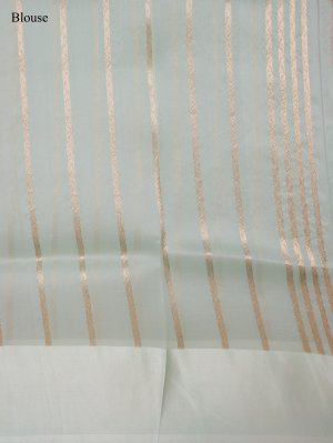 This Pastel Mint Green Organza Silk saree presents a sheer, airy texture across the body, meticulously printed with lush peach and rose-toned floral clusters. The structural integrity of the drape is anchored by a smooth satin silk border featuring metallic gold bird motifs, transitioning into a luminous pallu defined by dense gold zari stripes and horizontal lustrous bands. A coordinating self blouse piece with fine metallic linear patterns provides a grounded, balanced finish to this ethereal ensemble.