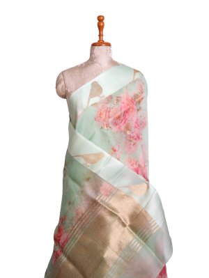 Pastel Mint Green Printed Organza Silk Saree with Self Satin Border