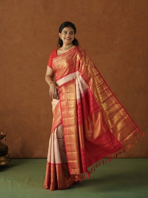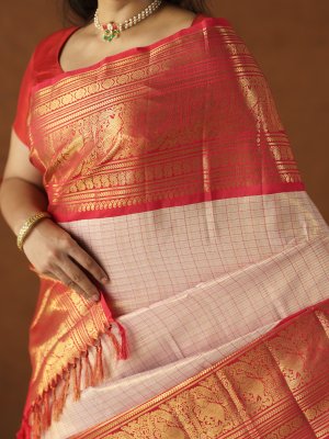 This Pastel Pink Checked Kanjeevaram Silk saree features a red border intricately woven with temple-inspired bird and animal motifs in gold zari. The body showcases a subtle self-checkered pattern that complements the heavy red pallu and its traditional architectural detailing. A masterful blend of heritage artistry and vibrant contrast, perfect for grand celebrations.