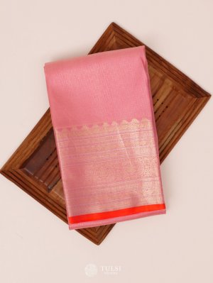 This Pastel Pink Kanjeevaram Silk Blouse exudes festive brilliance, woven in luxurious silk that glows with a rich golden sheen. Its vibrant hue and intricate zari detailing make it a perfect match for traditional Kanjeevaram sarees, elevating any heritage ensemble with elegance.