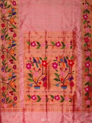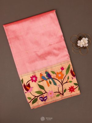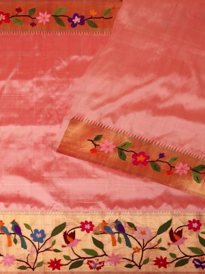 This Pastel Pink Paithani Silk Saree captures the essence of traditional Maharashtrian craftsmanship with its vibrant body and exquisitely woven border. The saree features a rich Paithani border adorned with colorful floral and vine motifs, adding a lively yet regal touch. Subtle buttas on the body enhance its elegance, while the lustrous silk drape gives it a luxurious finish.