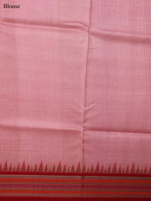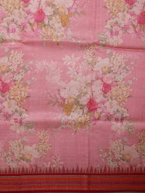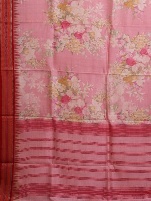 This Pastel Pink Printed Tussar Silk saree features a lustrous, grainy body adorned with soft floral motifs that transition into a striking red and orange Vidarbha border with sharp temple-inspired triangular patterns. The smooth red border frames the piece with intricate geometric bands, leading to a coordinated pink pallu detailed with clean, horizontal red stripes. Completed with a matching pastel pink blouse piece, the ensemble provides a refined and effortless drape for any occasion or gatherings.