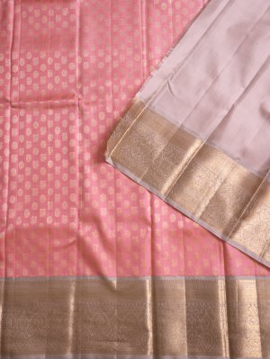 This Peach Pink Kanjeevaram Silk Pavadai features a luminous body adorned with alternating diagonal stripes of golden Annapakshi and Rudraksh motifs that shimmer with every movement. The ensemble is anchored by a contrasting light grey border intricately woven with traditional peacock patterns, blooming florals, and rich manga buttas. A matching light grey silk blouse piece completes this regal look, offering a refined aesthetic perfect for grand celebrations and heritage ceremonies.