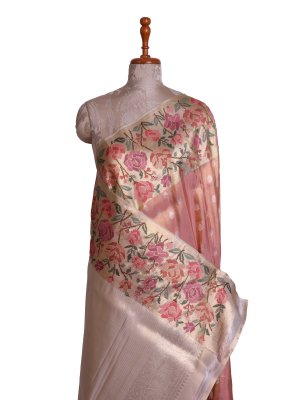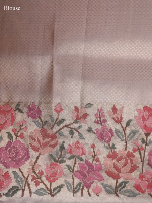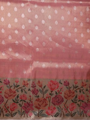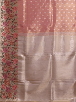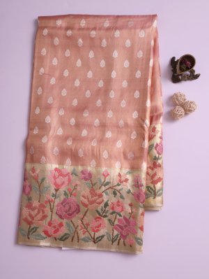 This Peach Pink Tissue Kanjeevaram Silk saree radiates a metallic shimmer through its translucent, ethereal texture, draped elegantly to reveal intricate silver buttas scattered across the body. The substantial beige tissue border anchors the garment with vibrant floral embroidery of roses and vines in shades of pink, brown and magenta, creating a garden-inspired aesthetic that transitions seamlessly into a weighted, high-shine pallu. Lustrous threads interweave with heavy zari accents to ensure a regal silhouette, finished with a tonal blouse piece that mirrors the rich, tactile detailing of the floral craftsmanship