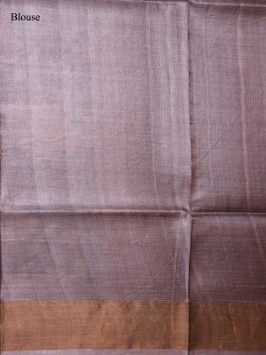 This Peacock Blue Tussar Silk saree reveals a coarse yet lustrous texture that drapes with elegant weight and organic grace. A wide antique bronze border provides metallic structure against the floral body, grounding the ethereal botanical motifs with a solid, light-catching frame. The pallu transitions into a series of shimmering metallic bands and rhythmic horizontal stripes, culminating in a refined raw-edge fringe for an artisanal finish.