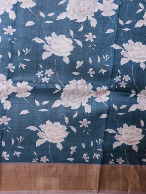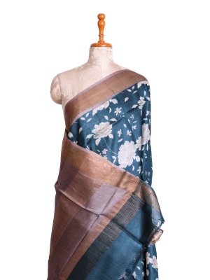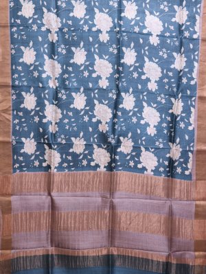 Dusty Greenish Blue Printed Tussar Silk Saree