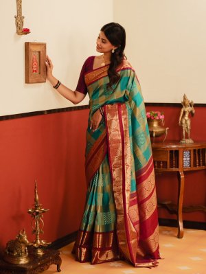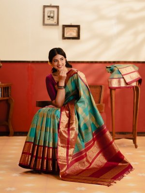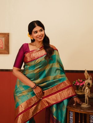 Green Kanjeevaram Silk Saree With Light Blue Border
