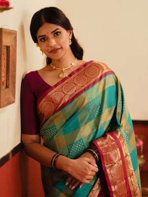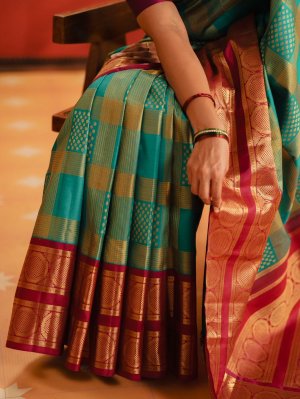 Crafted 9 - Tri Color Checked Kanjeevaram Silk Saree With Light Blue Border