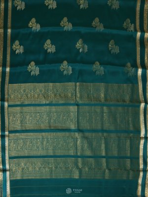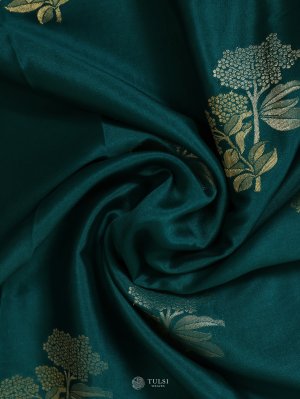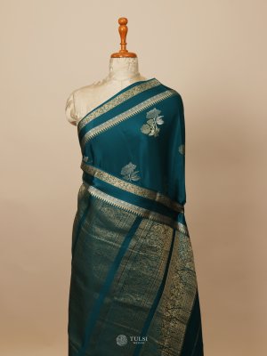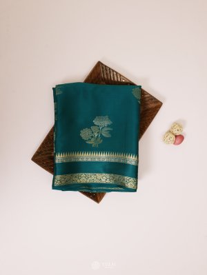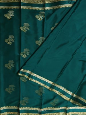This stunning Peacock Green Mysore Silk Saree radiates elegance with its rich, lustrous hue. Paired with a sophisticated self-border and floral buttas, this saree exemplifies the timeless charm and refined simplicity of Mysore silk, making it a perfect choice for any elegant occasion.