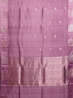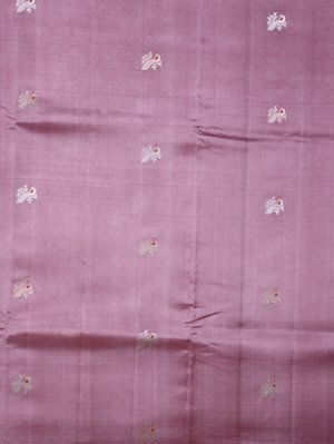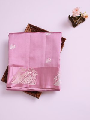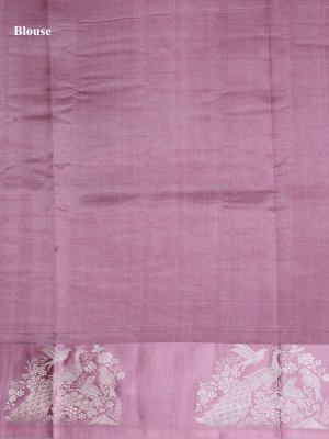 Graceful and vibrant, this Mashru silk saree in Lavender is enhanced with exquisite zari peacocks and hints of red and rani pink meena work. Its satin border is adorned with charming peacocks, butterflies, and parrots amid elegant natural motifs. The pallu is a visual masterpiece, featuring elaborate zari peacocks and birds, interlaced with refined floral and nature-inspired designs.