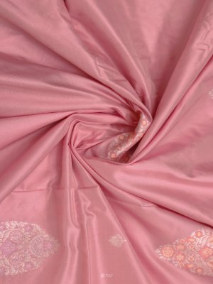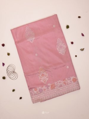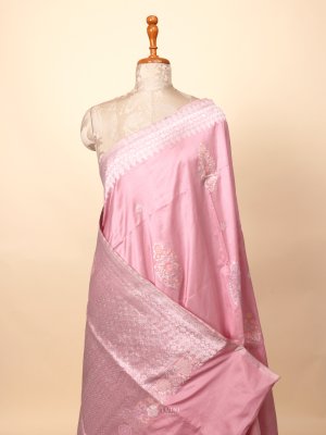 This Pink Banarasi silk saree adorned with intricate silver zari work, featuring delicate floral motifs across the body and a richly woven traditional pallu, offering a timeless and elegant festive charm.