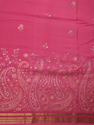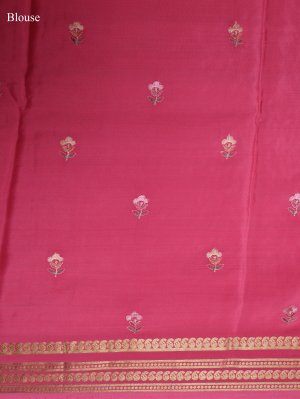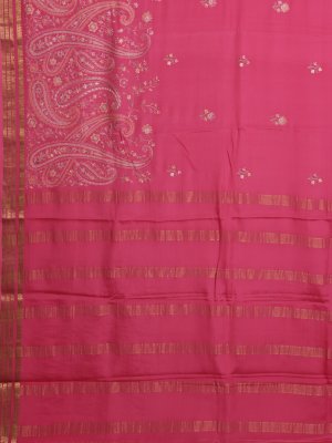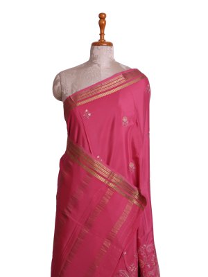 This Pink Mysore Crepe Silk saree carries a weighted grace with delicate floral sprigs across the body and dense paisley embroidery anchoring the lower hem. Gold zari lines define the border with geometric precision, leading into a pallu finished with parallel metallic bands and fine zari work. The substantial texture of the crepe ensures a grounded drape suitable for cultural ceremonies and festivities..