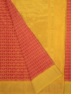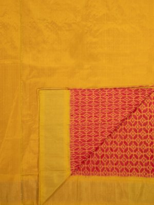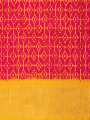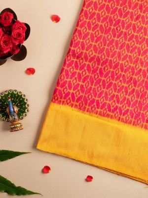 This handwoven pink Ikat silk saree has geometric mustard-yellow patterns all over. It is paired with a mustard-yellow border with a sheer gold zari detailing.