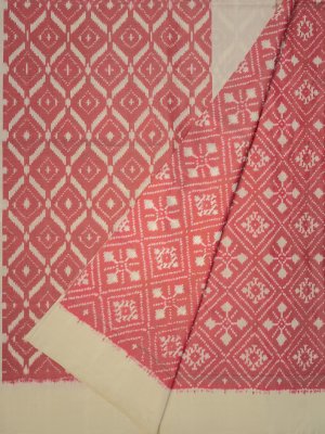 This handwoven Ikat silk has a pink body that is adorned with off-white geometric ikat patterns. It is paired with an elegant off-white border.