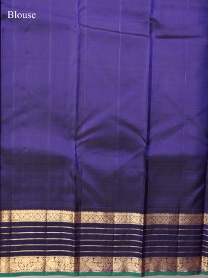 This exquisite Kanjeevaram silk saree features a soft pink body adorned with delicate peacock and kamalam buttas, exuding timeless elegance. The contrast dark navy blue border is richly designed with zari stripe Banaras, peacocks, and intricate kodi patterns, complemented by a striking green jamadu. The pallu and blouse in matching navy blue complete the look, creating a harmonious blend of traditional craftsmanship and contemporary charm.