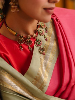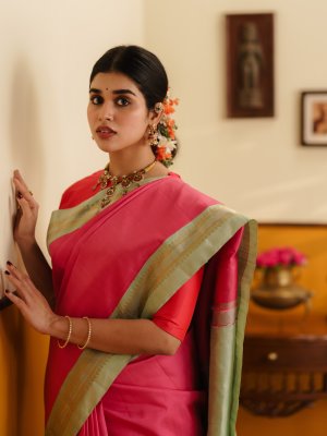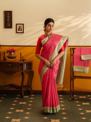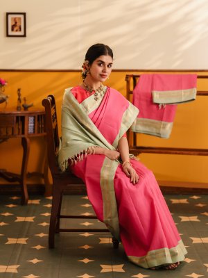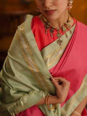 This Pink Kanjeevaram Silk Saree with a Light Green Border beautifully captures the essence of vintage elegance. The harmonious blend of soft pink silk and a subtle green border evokes the charm of old-world craftsmanship. Delicate zari work and intricate traditional motifs lend it a regal, perfect for those who appreciate sarees with a timeless, vintage vibe.