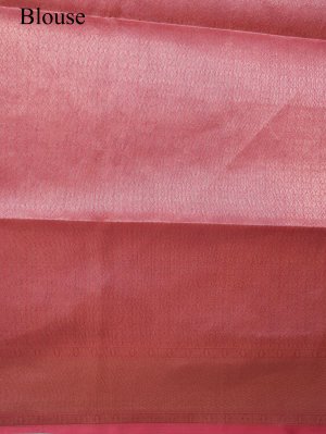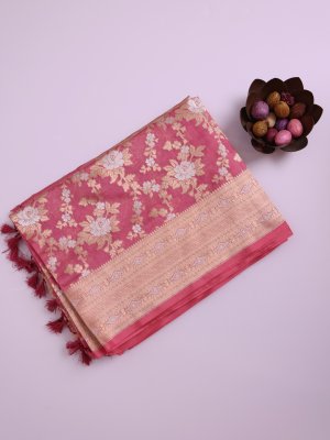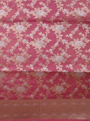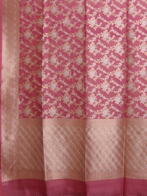 This is a beautiful Light pink Kora silk saree. The body has simple white and gold zari floral designs spread all over. The border also has rich gold zari work, which adds a nice shine. The mix of pink, white, and gold gives the saree a soft and elegant look.