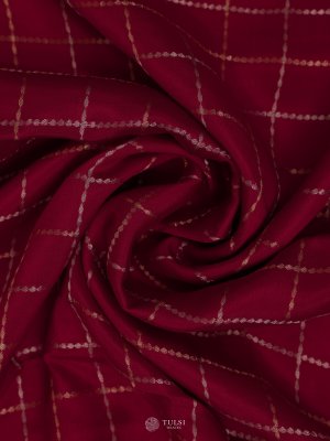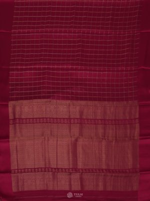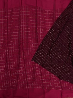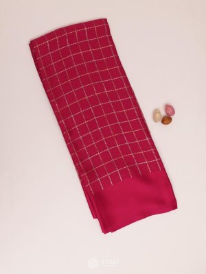 This Pink Mysore silk saree exudes timeless charm. The deep Pink body is adorned with delicate checkered motifs that add a touch of classic sophistication. A smooth satin border frames the saree, enhancing its luxurious drape and subtle sheen.