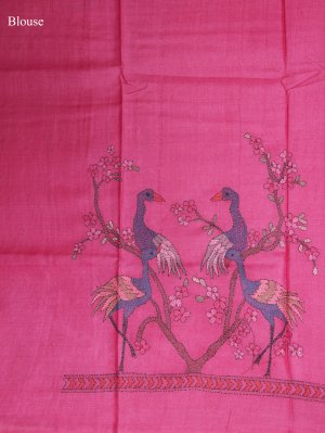 This Pink Printed Tussar Silk saree features a striking diamond Shibori pattern on the body complemented by delicate Black Kantha embroidery lines on the border. The pallu showcases an intricate hand-crafted landscape of blooming lotus flowers and graceful swans amidst a serene pond setting, while the blouse piece is adorned with two beautiful birds perched on floral branches. It is a masterpiece of traditional artistry and modern elegance, perfect for festive occasions and making a sophisticated statement.