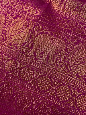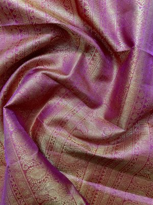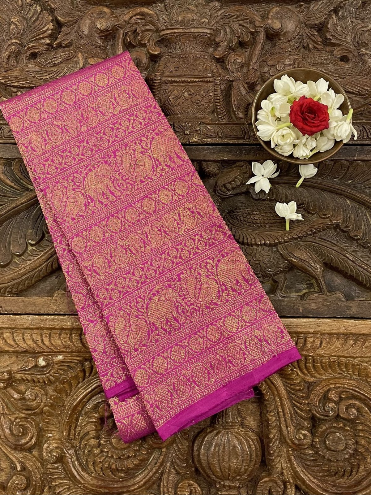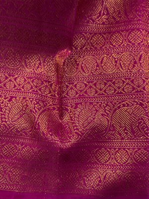 This handwoven pink and purple Kanjeevaram silk blouse is adorned with elaborate gold zari elephant and peacock motif detailing all over.