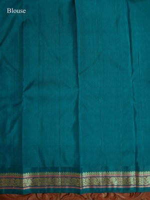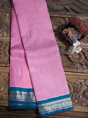 This elegant pink striped Kanjeevaram pattu pettu silk saree features a graceful body adorned with teal blue stripes that add a fresh contrast. The teal blue border is beautifully woven with traditional motifs in light green and pink silk threads, enhanced with subtle zari seer detailing. Crafted in rich silk, this saree reflects classic Kanjeevaram artistry with a modern color palette. Perfect for weddings, festive occasions, and timeless ethnic styling.