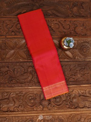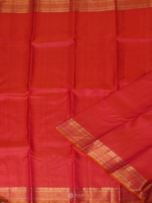 This Pinkish Orange Kanjeevaram Silk Saree, a refined piece woven with the intricate vaira oosi technique. The rich Pinkish Orange body is complemented by a lustrous gold zari border and pallu, adding a regal charm to its traditional appeal. Crafted from pure silk, this saree captures the perfect blend of sophistication and heritage.