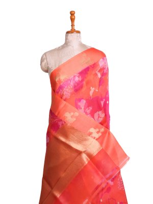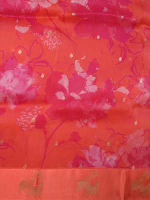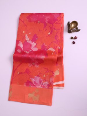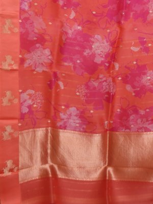 Pinkish Orange Printed Organza Silk Saree with Orange Satin Border