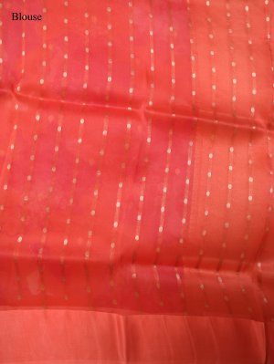 This Pinkish Orange Printed Organza saree feels weightless and airy, showcasing large rose-hued floral motifs scattered across a translucent, matte body. The structured orange satin border provides a luminous contrast, detailed with metallic gold cow and tree motifs for a refined cultural edge. A lustrous gold zari pallu completes the look, paired with a matching orange blouse featuring linear metallic stripes for a polished finish.