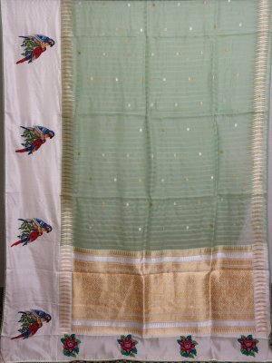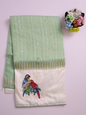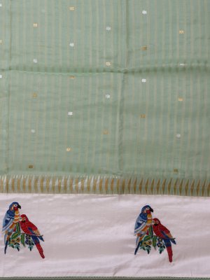 Elegantly crafted, this Banaras Organza Saree presents a pista green base with delicate light green stripes and shimmering gold-silver zari kamalam buttas. Its off-white silk border is a canvas for vibrant appliqué parrots in multi-colors, creating a lively contrast. The pallu carries exquisite zari designs, the hem is decorated with appliqué flowers, and the blouse mirrors the saree’s intricate stripe and zari kamalam patterns.