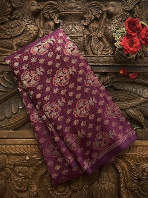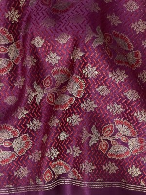 This Handwoven Purple Banaras Silk Blouse has floral butties and thread work detailing spread all over.