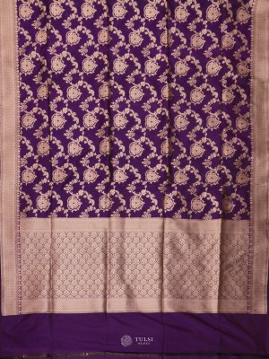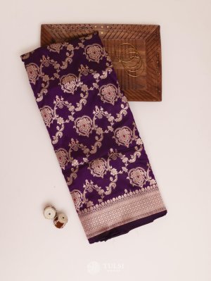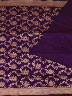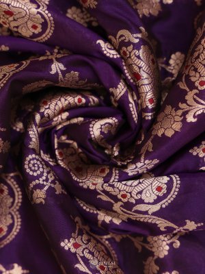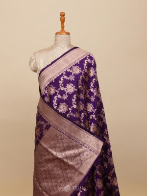 This Purple Banaras Silk Saree exudes regal elegance with its luxurious sheen and timeless craftsmanship. Adorned with intricate floral zari motifs across the body, it captures the grandeur of traditional Banarasi artistry. The richly woven golden zari border and pallu add a touch of opulence, making it perfect for festive occasions and evening celebrations.