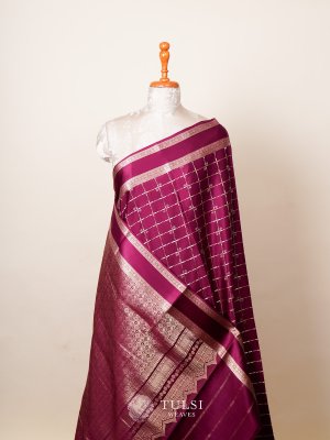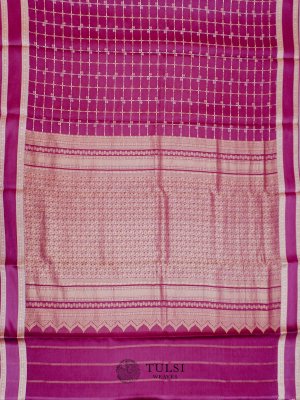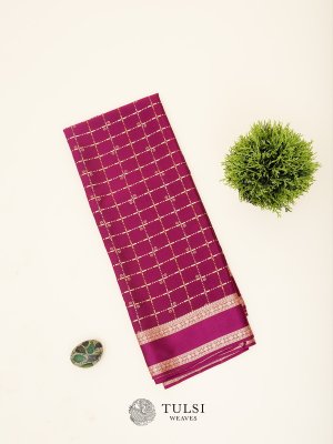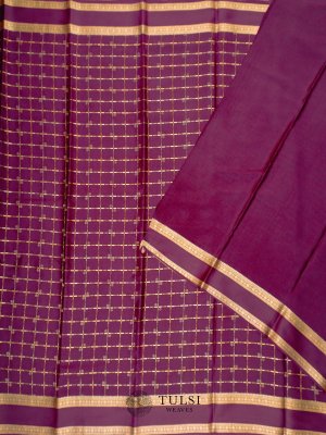 This Purple Mysore Silk Saree features a checked pattern with a self zari border in two refined lines, combining classic charm with sophisticated style.