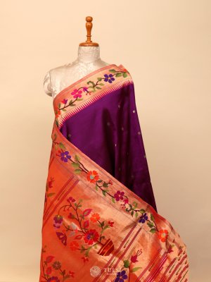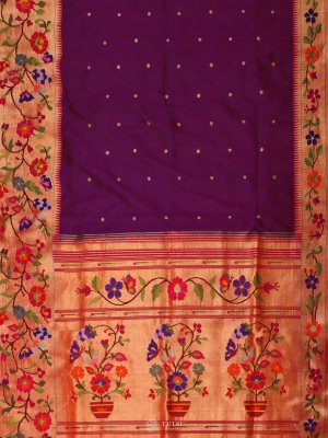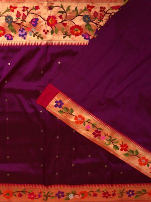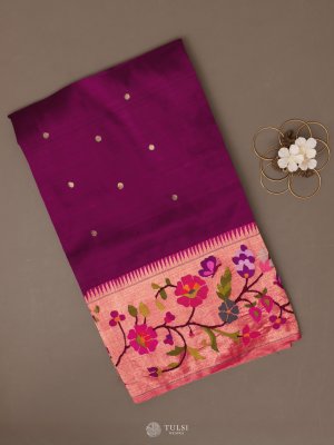 This Purple Paithani Silk Saree captures the essence of traditional Maharashtrian craftsmanship with its vibrant body and exquisitely woven border. The saree features a rich Paithani border adorned with colorful floral and vine motifs, adding a lively yet regal touch. Subtle buttas on the body enhance its elegance, while the lustrous silk drape gives it a luxurious finish.
