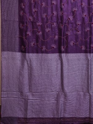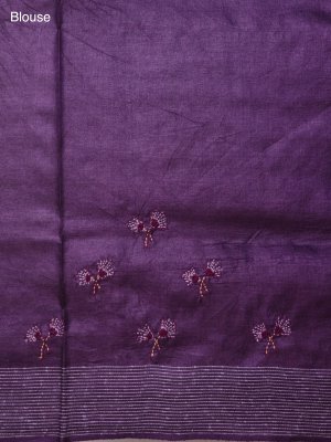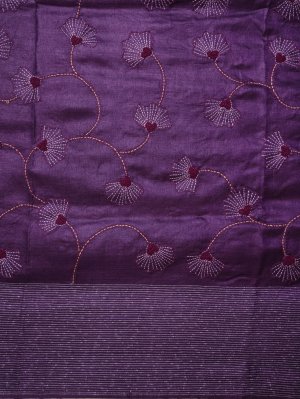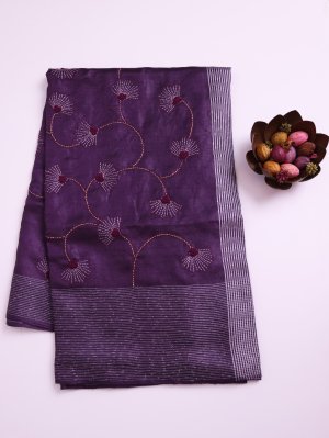 This purple tussar silk saree embodies the luxurious texture of pure tussar silk, adorned with exquisite Kantha embroidery. The hand-stitched floral motifs create an elegant interplay of tradition and artistry. This saree is a celebration of heritage craftsmanship, perfect for making a graceful and distinguished statement.