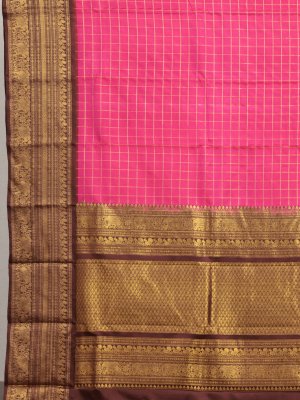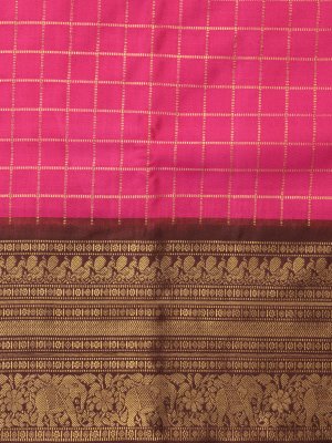 Rani Pink Checked Kanjeevaram Twill Saree With Brown Border