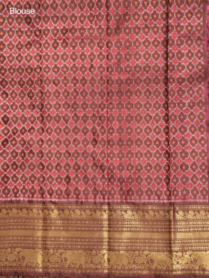 A Rani Pink Kanjeevaram Twill Saree with a contrasting brown border features a delicate zari-checked pattern, adding subtle shimmer and texture. The twill weave enhances the silk’s richness, while the brown border provides a striking, elegant contrast. Perfect for festive occasions and weddings, it combines vibrant color with timeless craftsmanship.